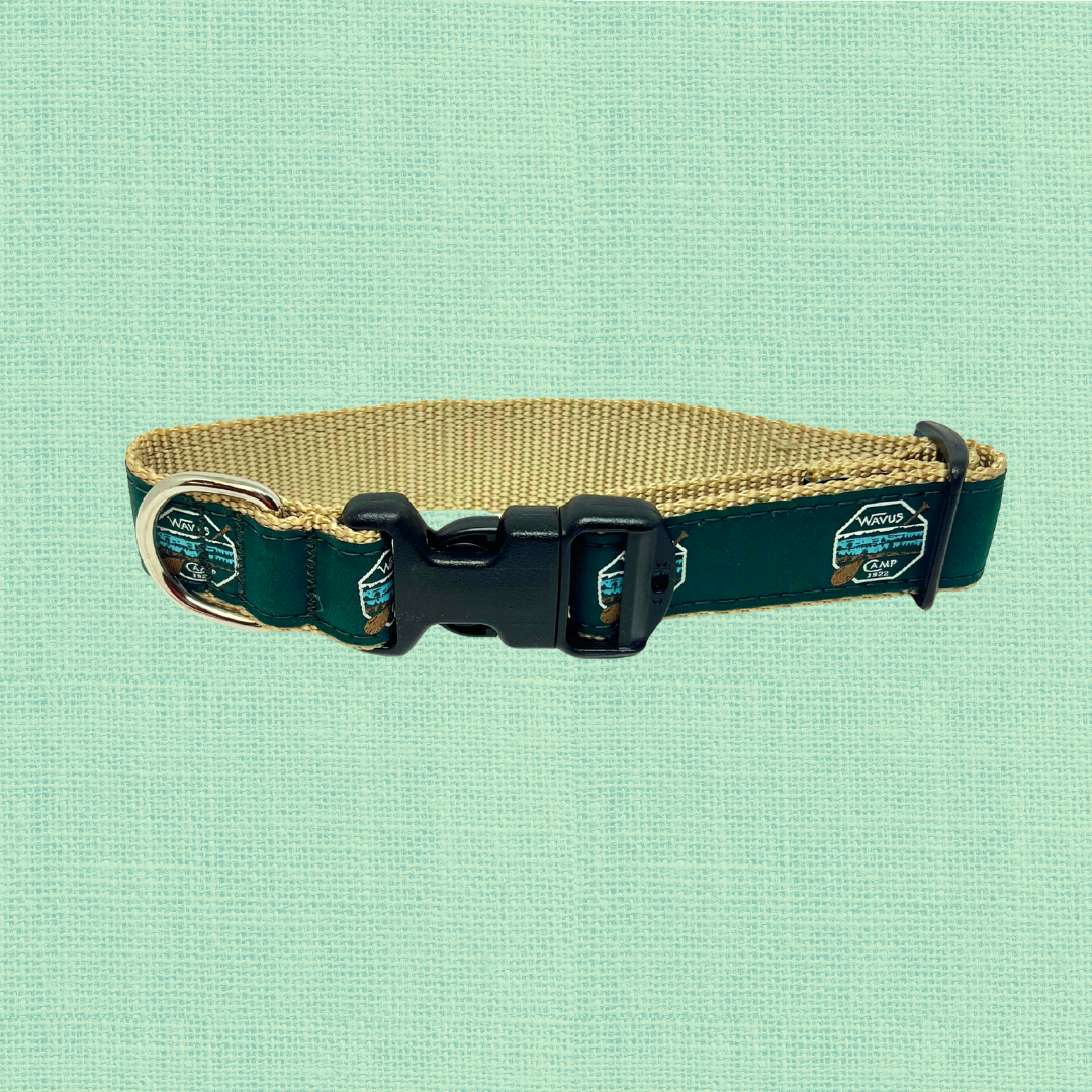 Wavus - Forest Green woven ribbon with the Wavus Logo on a Buff Nylon dog Collar